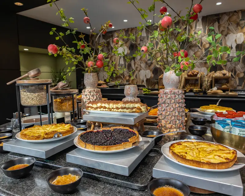 From noon to 3 p.m., the buffet unfolds like an invitation to every pleasure: golden pastries, an assortment of breads, jams and chocolate treats kick off the spread, before giving way to a colorful salad bar, a selection of fine cold cuts and aged cheeses. Lovers of warm flavors are not forgotten: scrambled eggs, crispy bacon, delicately roasted salmon, fragrant chicken, as well as heartier dishes like lasagna or roast beef, all serve to remind that brunch is an experience at the crossroads of breakfast and lunch. And since every convivial moment should end on a sweet note, cheesecakes, tiramisu, chocolate mousses and fresh fruit elegantly extend the interlude.